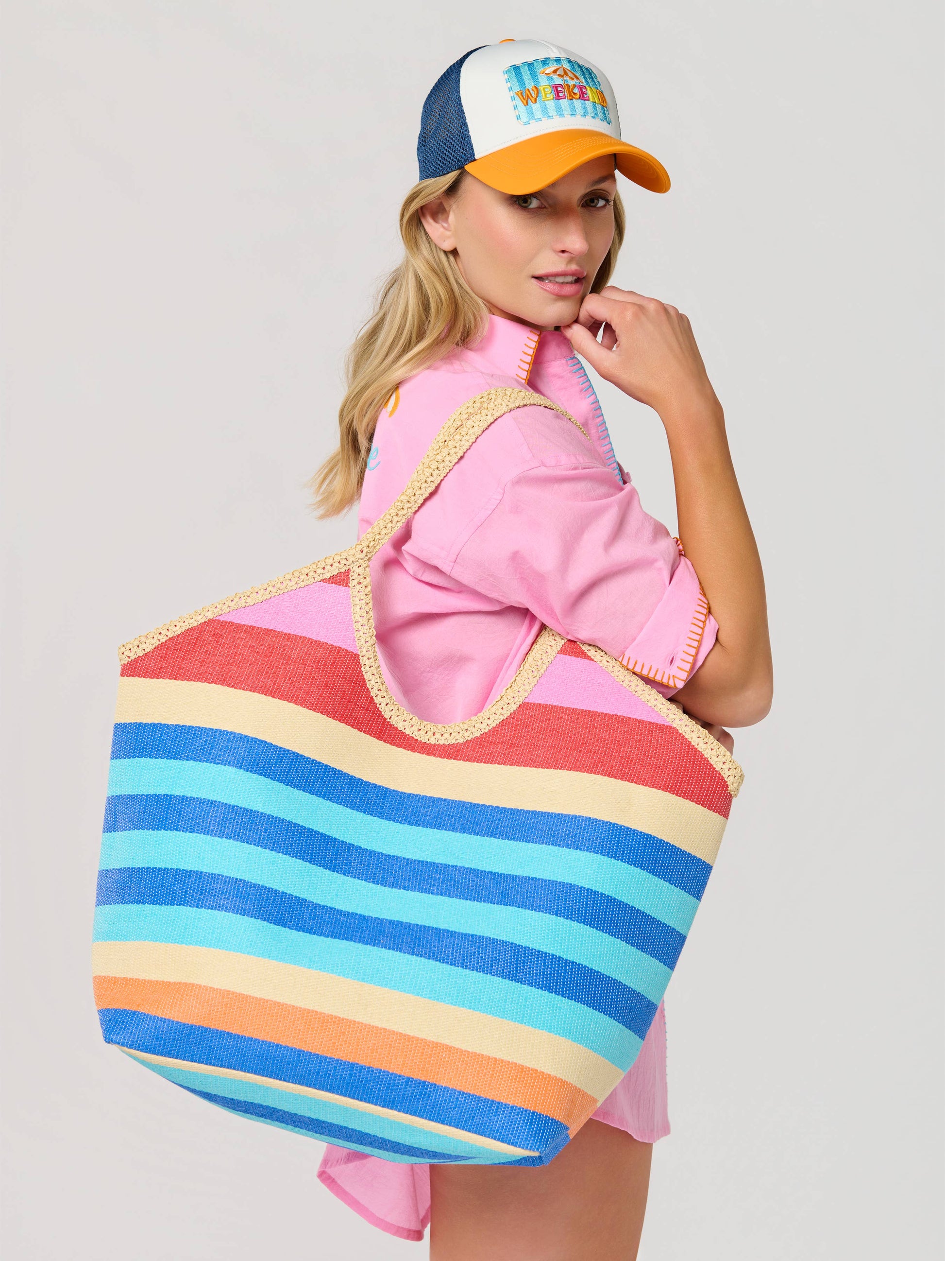 L 20” x W 7.5” x H 16”; straps 12"; paper straw; double shoulder straps; magnetic snap closure; 1 inner slip pocket