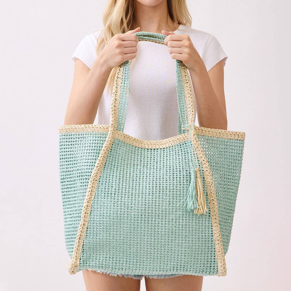 Tassel Accent Two Tone Woven Straw Tote Bag